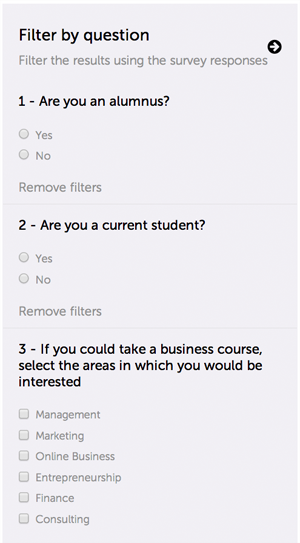 Overlay multiple filters to identify patterns and demographic trends in your survey responses. Answers to any of the questions from your survey can be used as filters.