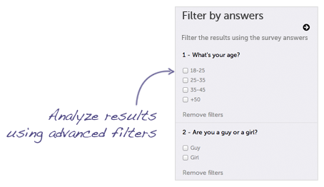 Obtain the insights you need to make the best business decisions by filtering and segmenting the results of your survey in real time. You can filter by any of the questions and answer fields you included in your survey
